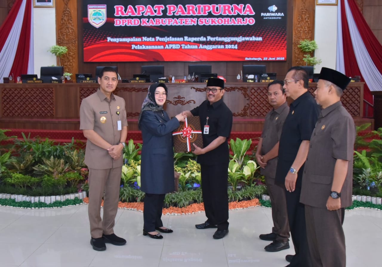 SUKOHARJO – Bupati Sukoharjo menyampaikan Nota Penjelasan Raperda Pelaksanaan Anggaran Pendapatan dan Belanja Daerah Kabupaten Sukoharjo Tahun Anggaran 2024 di DPRD.
