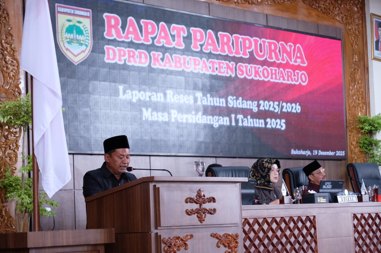 SUKOHARJO – DPRD Kabupaten Sukoharjo menggelar Rapat Paripurna dengan agenda membacakan Laporan Pelaksanaan Penyerapan Aspirasi Masyarakat atau Reses Tahun Sidang 2025/2026 Masa Persidangan I tahun 2025, 19 Desember 2025.